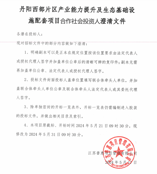 丹陽西部片區(qū)產業(yè)能力提升及生態(tài)基礎設施配套項目含作社會投資人澄清文件,各潛在投標人:現對招標文件中的部分內容做如下澄清